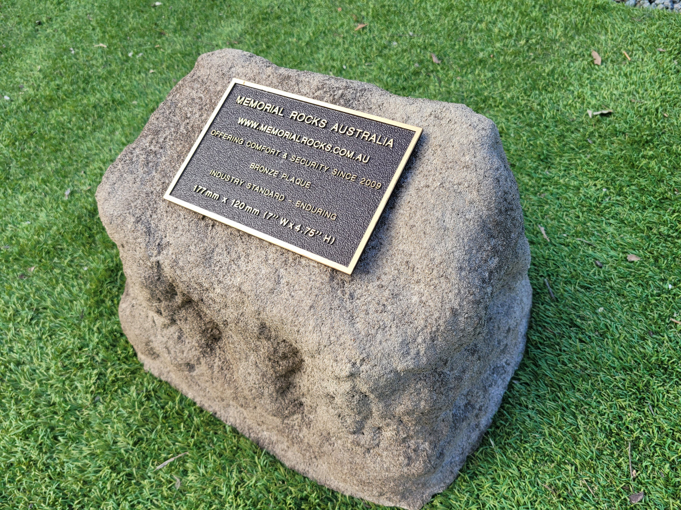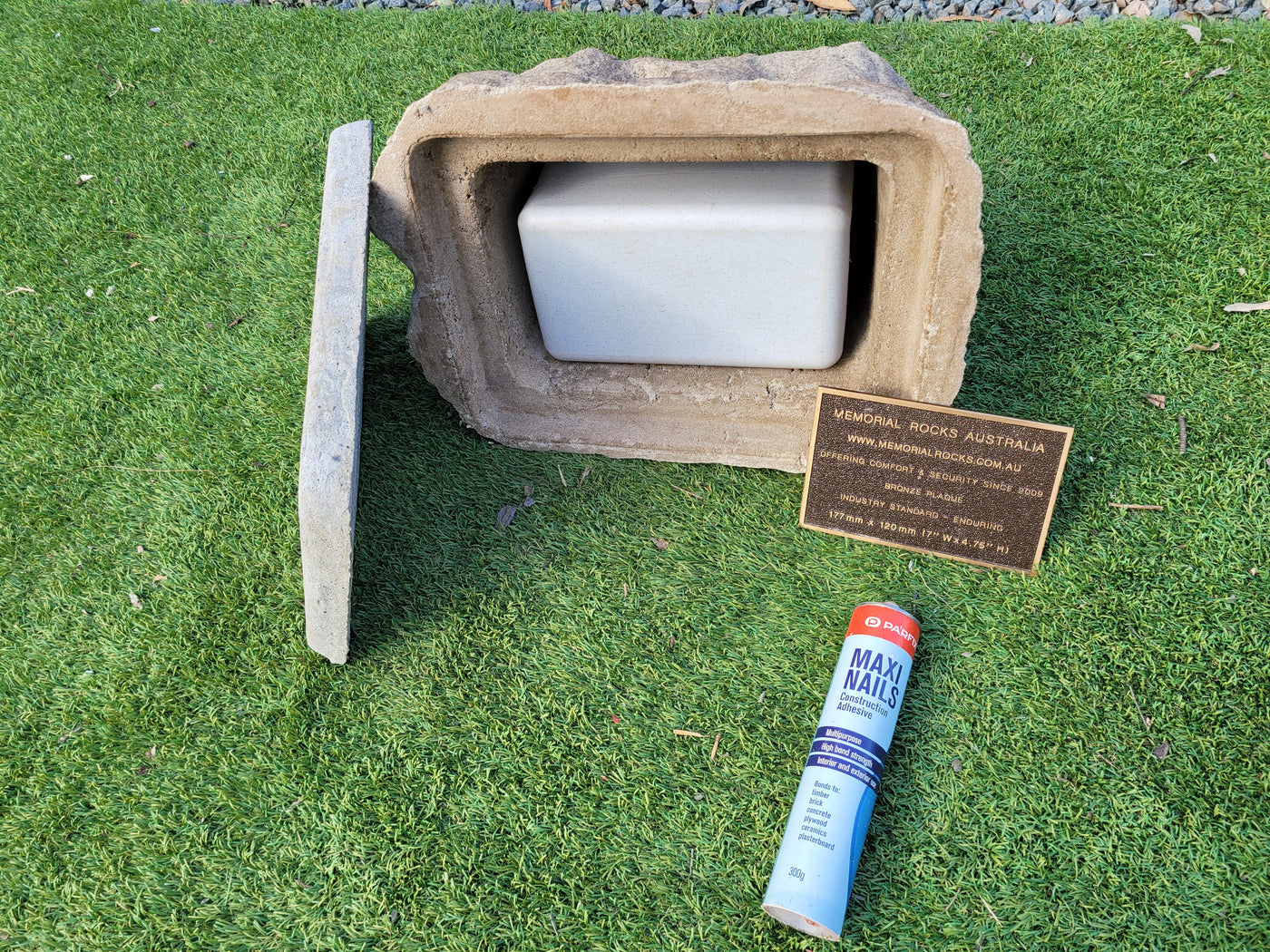 Proudly an original Australian product idea operating since 2009. Large Single Size Approx. 24 kg. Memorial Rock/Stone/Urn with a sealable internal cavity for the safe-keeping of a loved one's ashes. Holds one standard Australian sized ash container, plus memorabilia. Size Approx. 450mm x 390mm x 300mm (external). 270mm x 230mm x 170mm (interna...