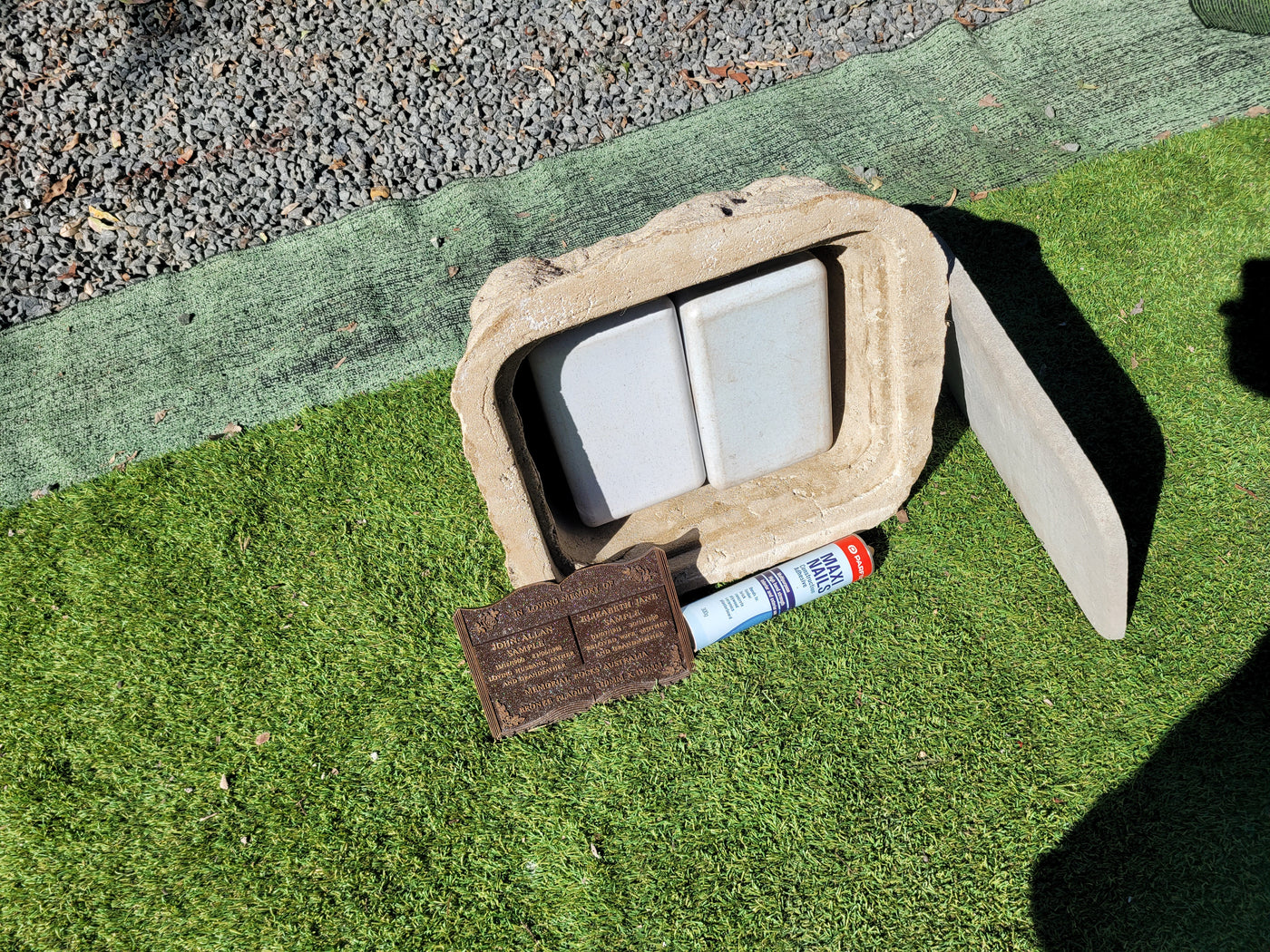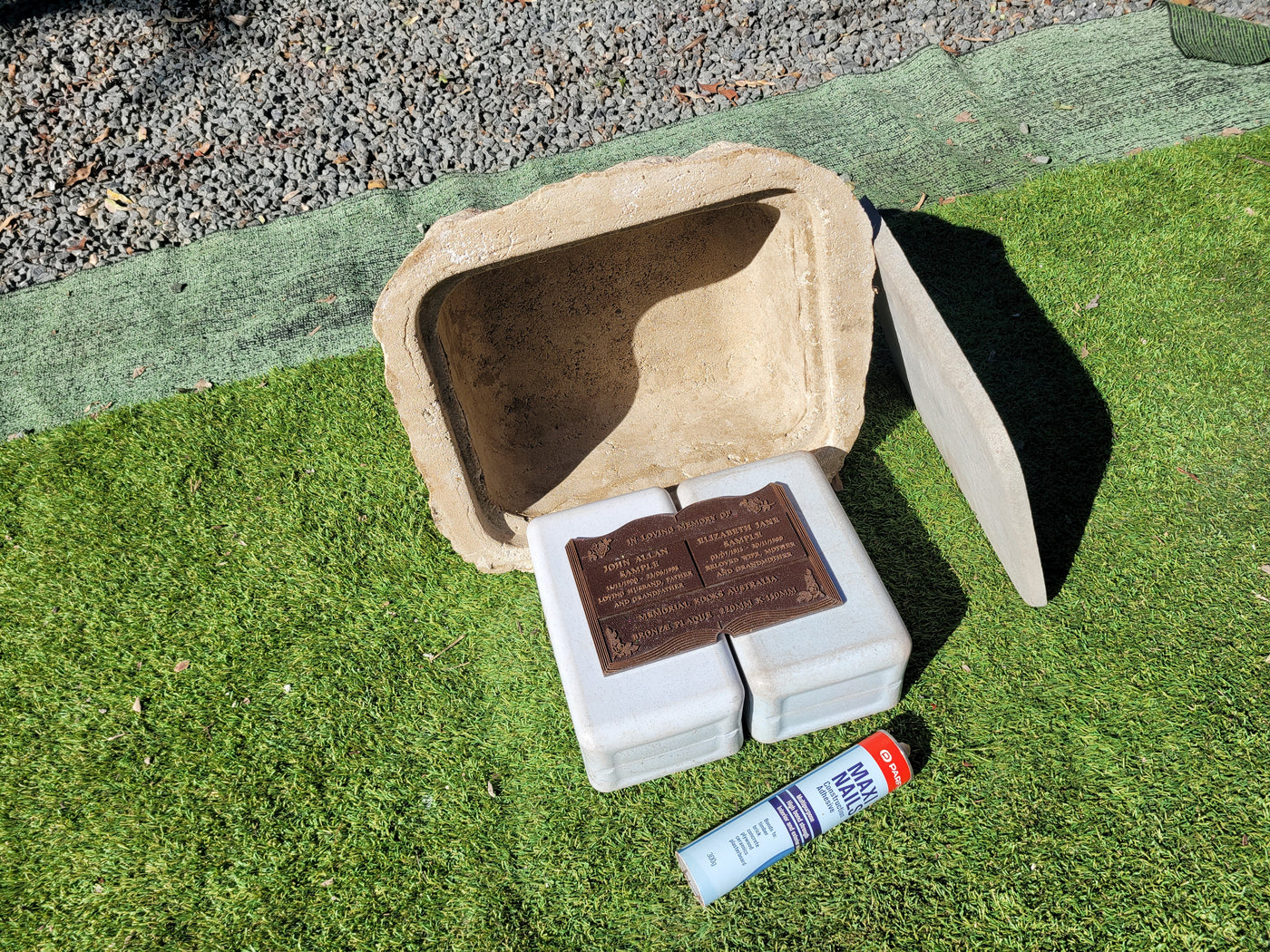 Proudly an original Australian product idea operating since 2009. Large Double Size Weight (approx. 24 kg) Memorial Rock/Stone/Urn with a sealable internal cavity for the safe-keeping of a loved one's ashes. Holds one or two standard Australian sized ash containers, plus memorabilia. Size Approx. 490mm x 410mm x 300mm (external). 320mm x 260mm ...