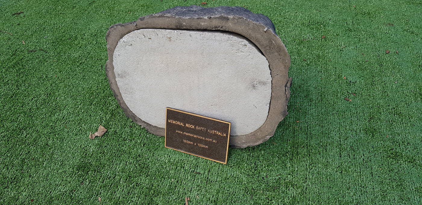 Memorial Rock Urns are a loving practical alternative for the safe keeping of a loved one's ashes. This Memorial rock has an incorporated flat space for up to a 150mm x 100mm x 4.5mm Plaque or our small heart plaque. (150mm x 100mm) PLAQUE SOLD SEPARATELY The blue plastic standard Australian sized cremation urn seen in the pictures demonstrate...
