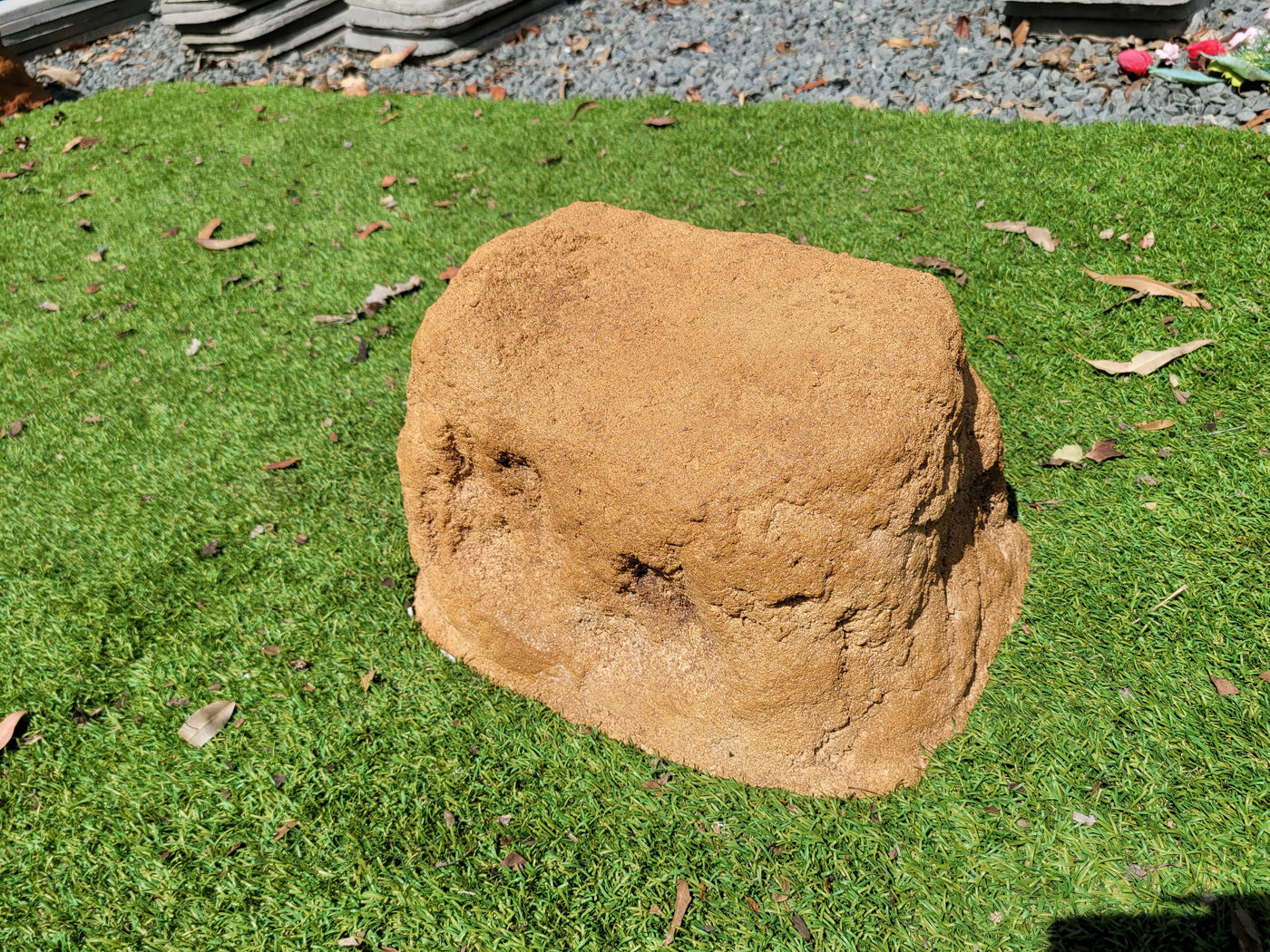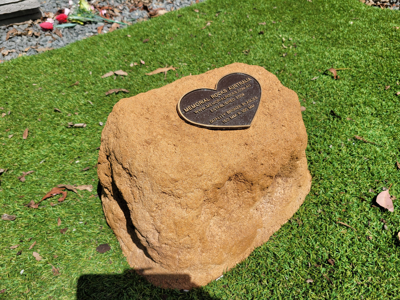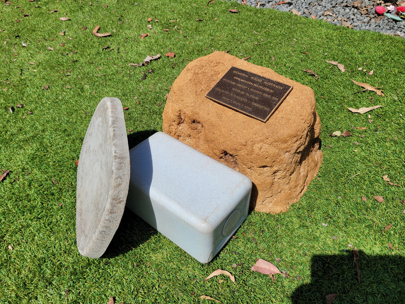 Memorial Rock Urns are a loving practical alternative for the safe keeping of a loved one's ashes. This Memorial rock has an incorporated flat space for up to a 180mm x 120mm x 4.5mm Plaque or our heart plaque. (200mm x 150mm) PLAQUE SOLD SEPARATELY The blue plastic standard Australian sized cremation urn seen in the pictures demonstrates the ...