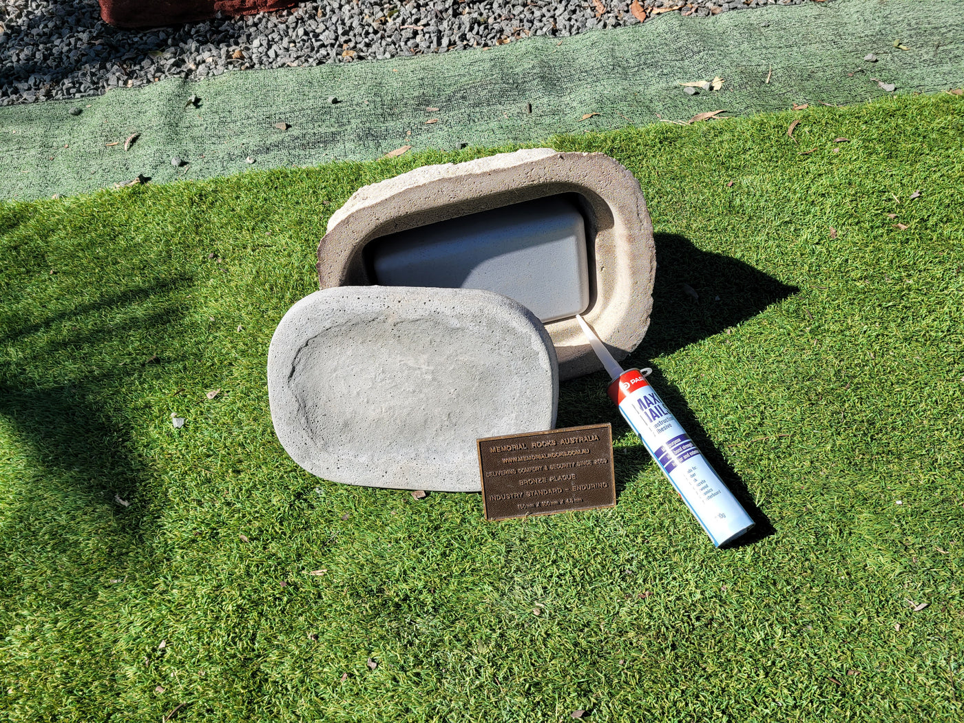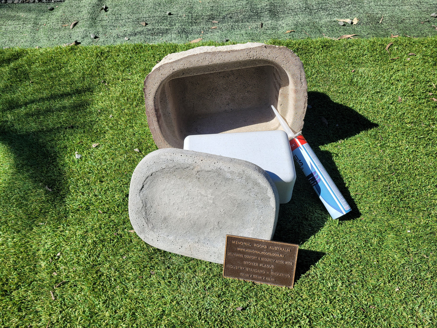 Memorial Rock Urns are a loving practical alternative for the safe keeping of a loved one's ashes. This Memorial rock has an incorporated flat space for up to a 180mm x 120mm x 4.5mm Plaque or our heart plaque. (200mm x 150mm) PLAQUE SOLD SEPARATELY The blue plastic standard Australian sized cremation urn seen in the pictures demonstrates the ...