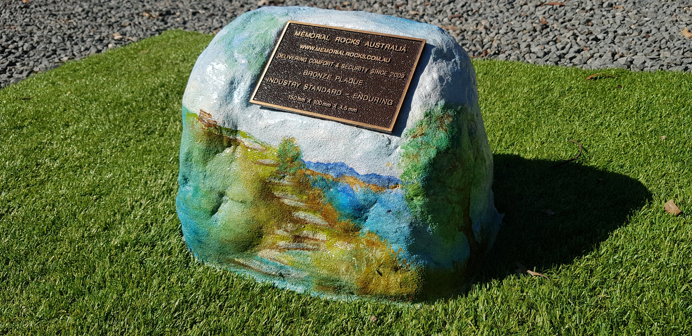 Memorial Rock Urns are a loving practical alternative for the safe keeping of a loved one's ashes. This Memorial Rock Urn has a small internal sealed container for partial ash interment. This Partial Ash Urn Memorial rock has an incorporated flat space for a 100 mm x 75mm x4.5mm industry standard bronze plaque. Proudly Australian made, origin...
