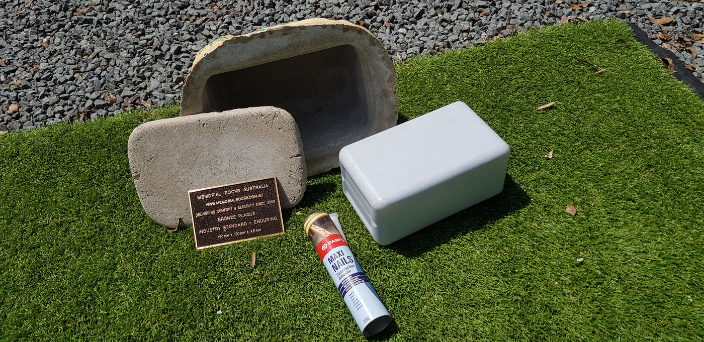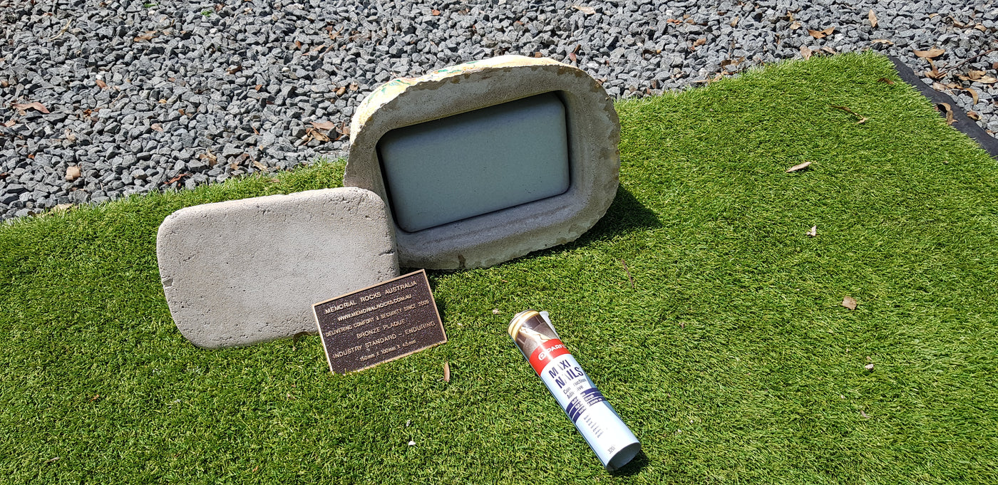 Memorial Rock Urns are a loving practical alternative for the safe keeping of a loved one's ashes. This Memorial Rock Urn has a small internal sealed container for partial ash interment. This Partial Ash Urn Memorial rock has an incorporated flat space for a 100 mm x 75mm x4.5mm industry standard bronze plaque. Proudly Australian made, origin...