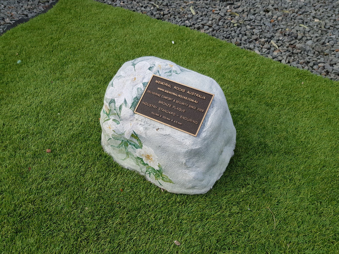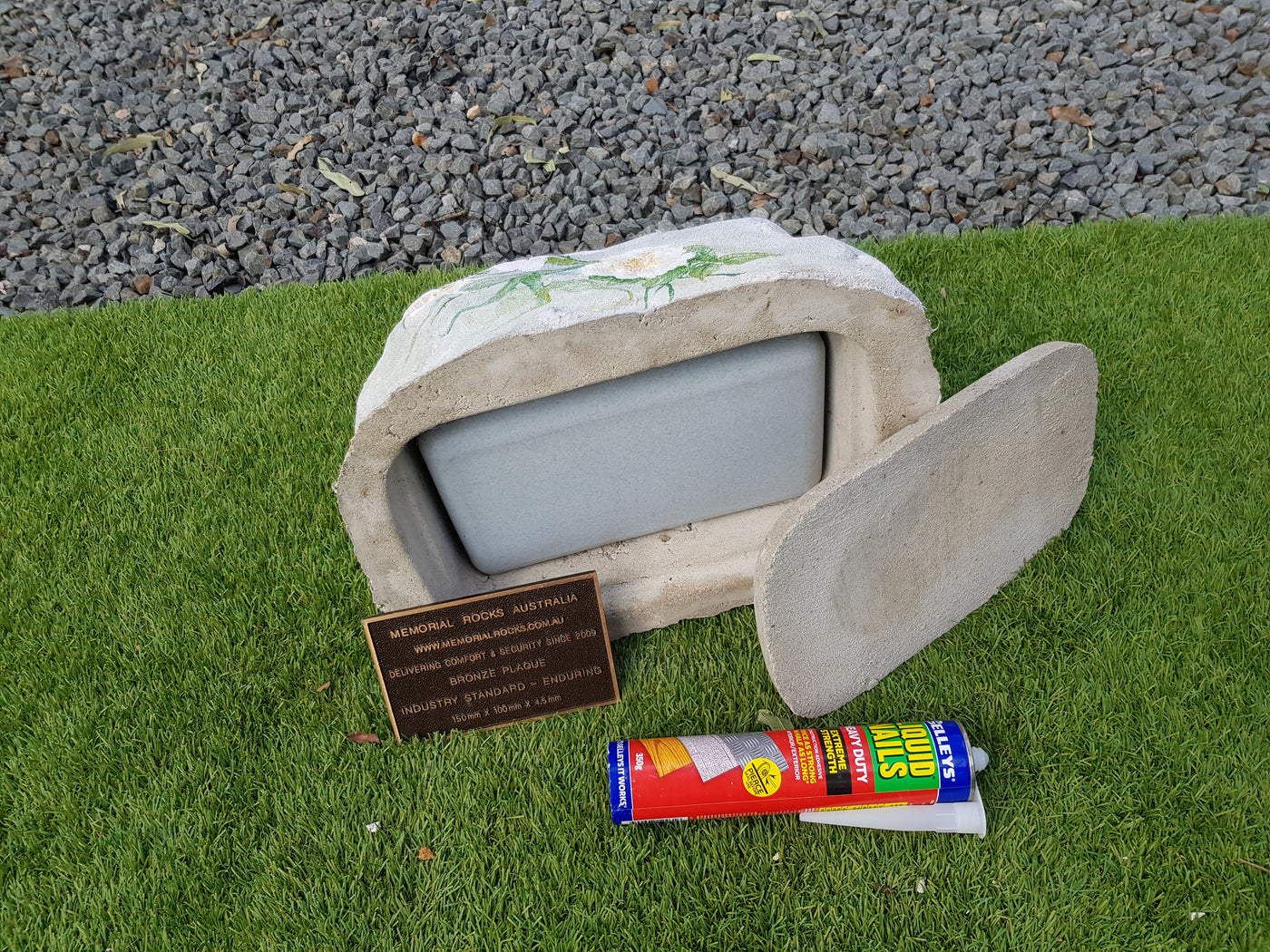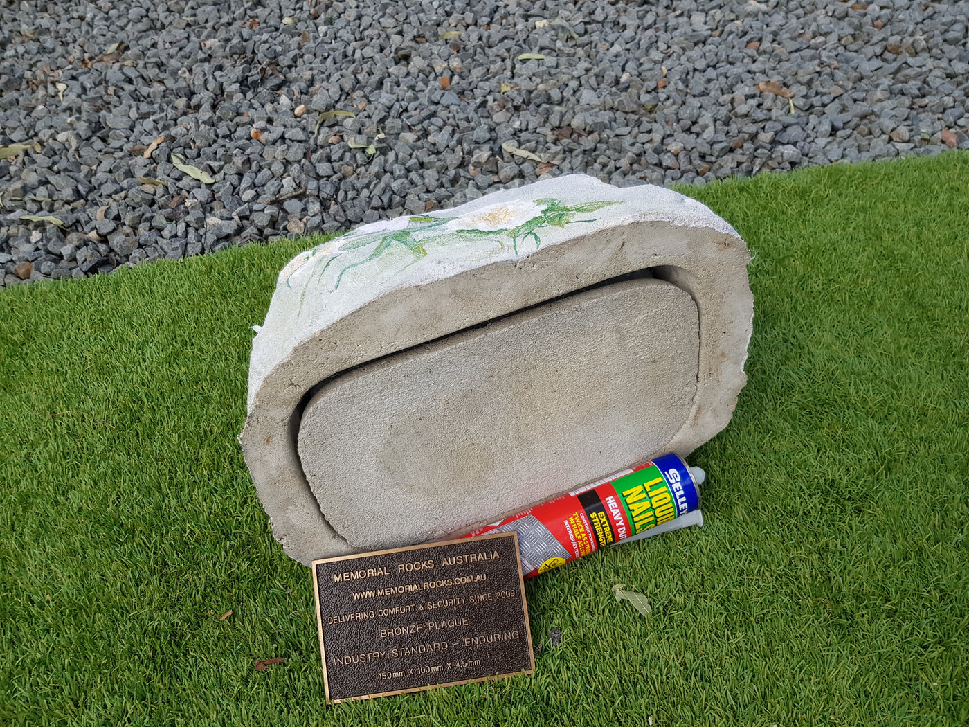 Memorial Rock Urns are a loving practical alternative for the safe keeping of a loved one's ashes. This Memorial Rock Urn has a small internal sealed container for partial ash interment. This Partial Ash Urn Memorial rock has an incorporated flat space for a 100 mm x 75mm x4.5mm industry standard bronze plaque. Proudly Australian made, origin...