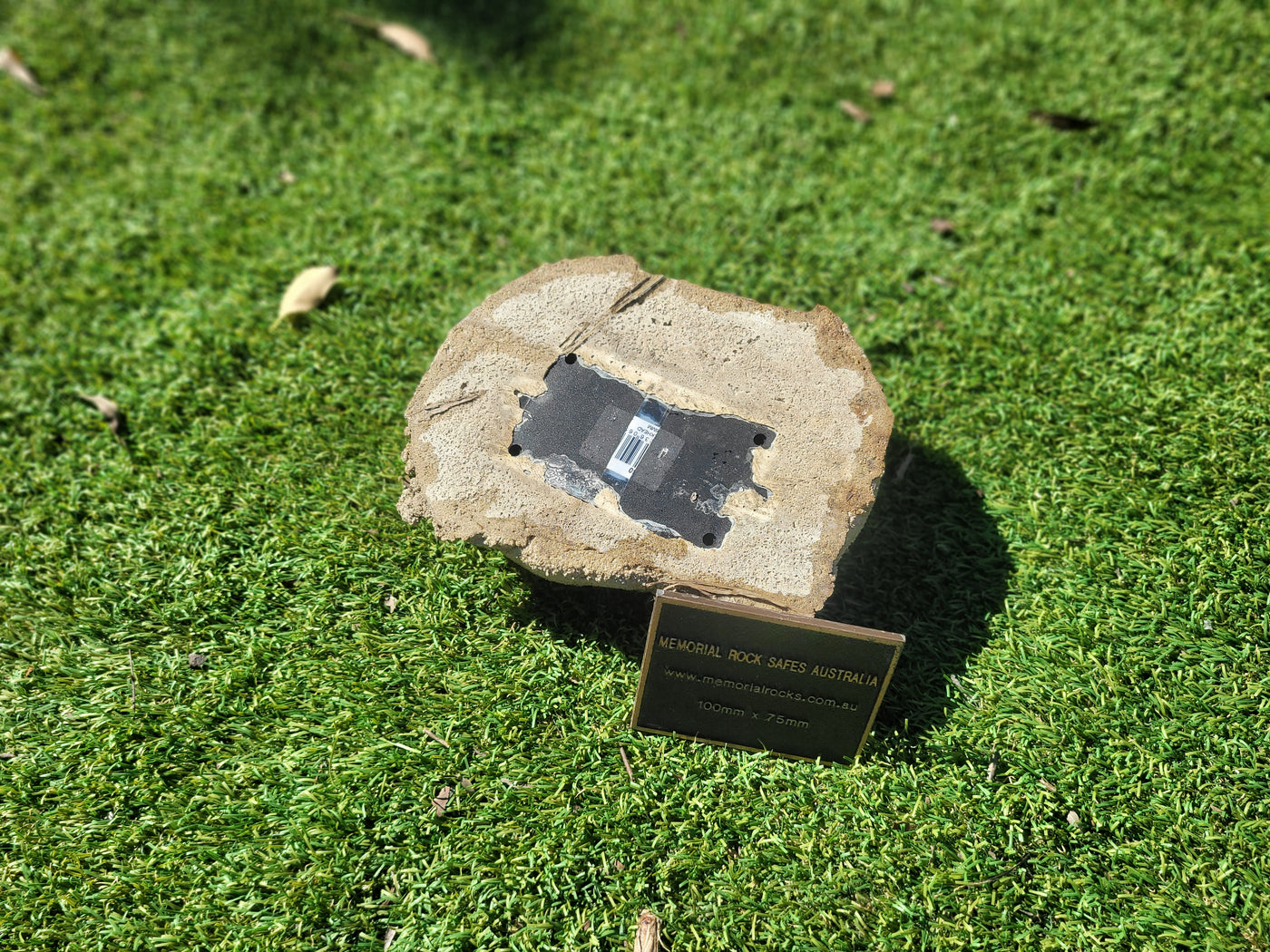 Memorial Rock Urns are a loving practical alternative for the safe keeping of a loved one's ashes. This Memorial Rock Urn has a small internal sealed container for partial ash interment. This Partial Ash Urn Memorial rock has an incorporated flat space for a 100 mm x 75mm x4.5mm industry standard bronze plaque. Proudly Australian made, origin...