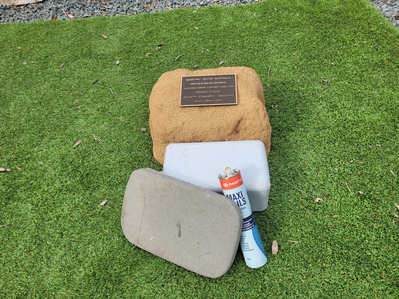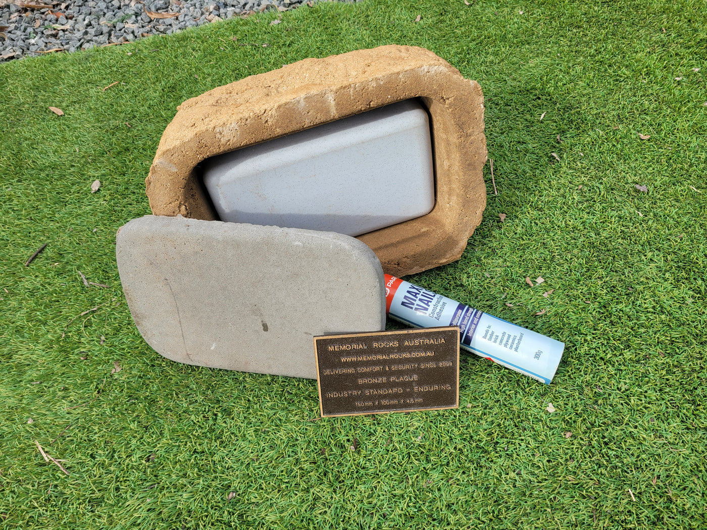 Memorial Rock Urns are a loving practical alternative for the safe keeping of a loved one's ashes. This Memorial rock has an incorporated flat indented recess space for a 150mm x 100mm x4.5mm industry standard bronze plaque. PLAQUE SOLD SEPARATELY Proudly an Australian made, original product. Operating since 2009. Regular size. Lightweight (a...
