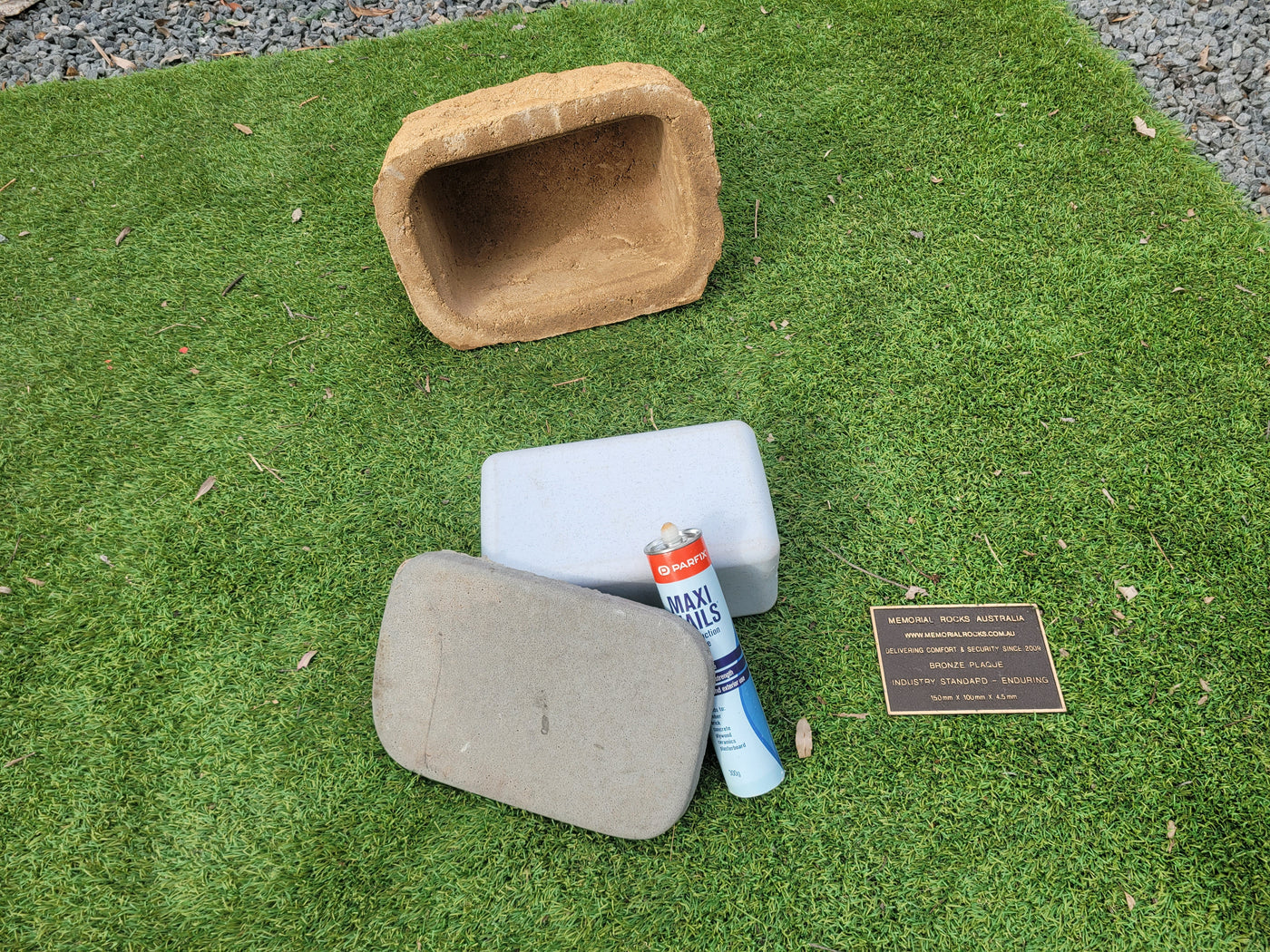 Memorial Rock Urns are a loving practical alternative for the safe keeping of a loved one's ashes. This Memorial rock has an incorporated flat space for a 150mm x 100mm x4.5mm industry standard bronze plaque. PLAQUE SOLD SEPARATELY Proudly an Australian made, original product. Operating since 2009. Regular size. Lightweight (approx. 12 kg) Me...