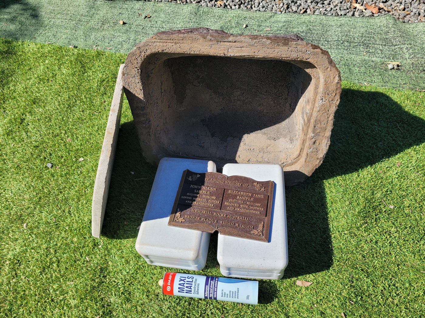 Proudly an original Australian product idea operating since 2009. Large Double Size Weight (approx. 24 kg) Memorial Rock/Stone/Urn with a sealable internal cavity for the safe-keeping of a loved one's ashes. Holds one or two standard Australian sized ash containers, plus memorabilia. Size Approx. 490mm x 410mm x 300mm (external). 320mm x 260mm ...